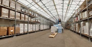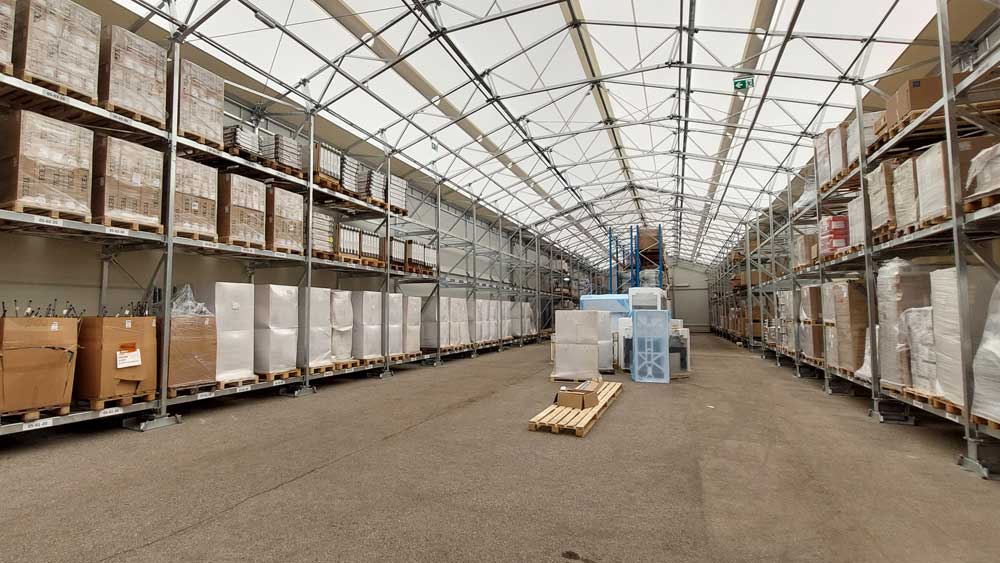 Zelthalle als niedriges einfaches Regallager mit integrierten Seitenregalen