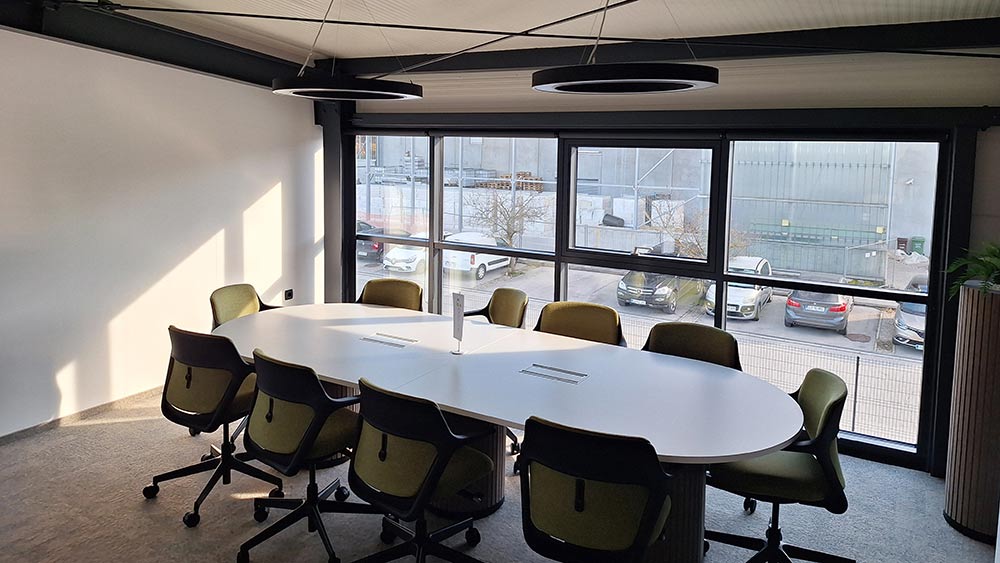 Der Bürobereich ist im industriellen Stil gestaltet, mit sichtbarer Stahlkonstruktion. Das reduziert die Kosten für Innenausbau und verleiht dem Raum ein modernes, technisches Erscheinungsbild. Die Büros bleiben hell, übersichtlich und leicht weiter ausstattbar.