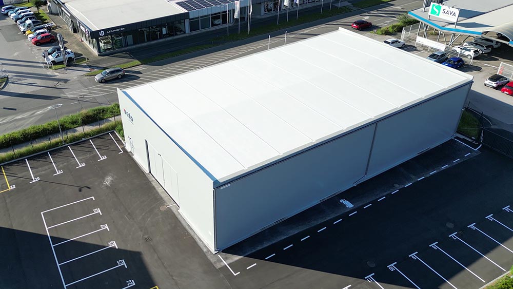 Das Lager befindet sich an der Ptujska cesta, einer der verkehrsreichsten Zufahrtsstraßen Maribors, was dem Kunden hervorragende Erreichbarkeit und optimierte Lagerwege gewährleistet. Es wurde als Schwarzmann X® Zelthalle mit Flachdach in den Abmessungen 20 × 34 Meter ausgeführt und ist architektonisch auf das bestehende Gebäude abgestimmt. Damit erhielt der gesamte Komplex ein geordnetes und professionelles Erscheinungsbild.